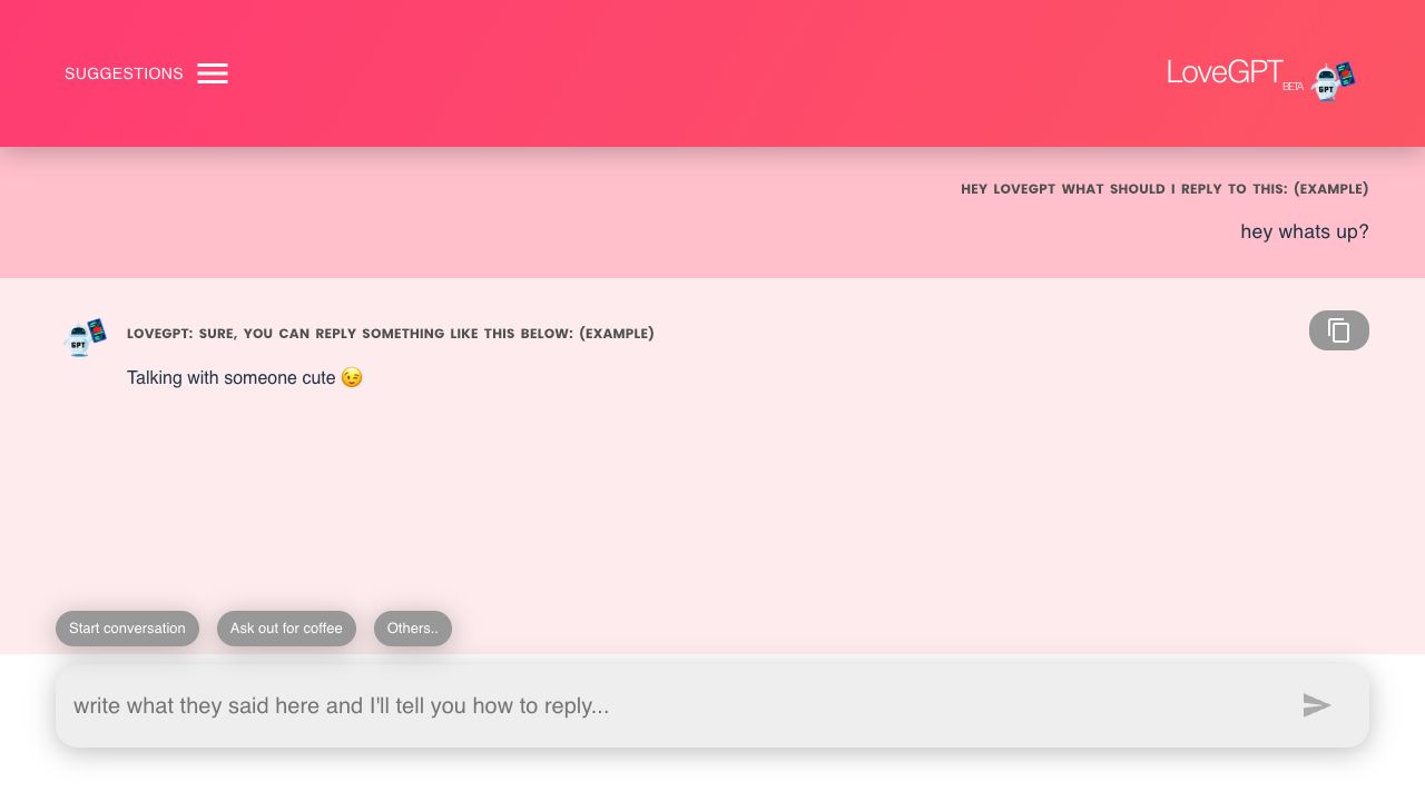 Use LoveGPT to generate ice-breaking flirty conversations, write proposals, or create love letters. Input your prompt or situation, and LoveGPT will provide suggestions.