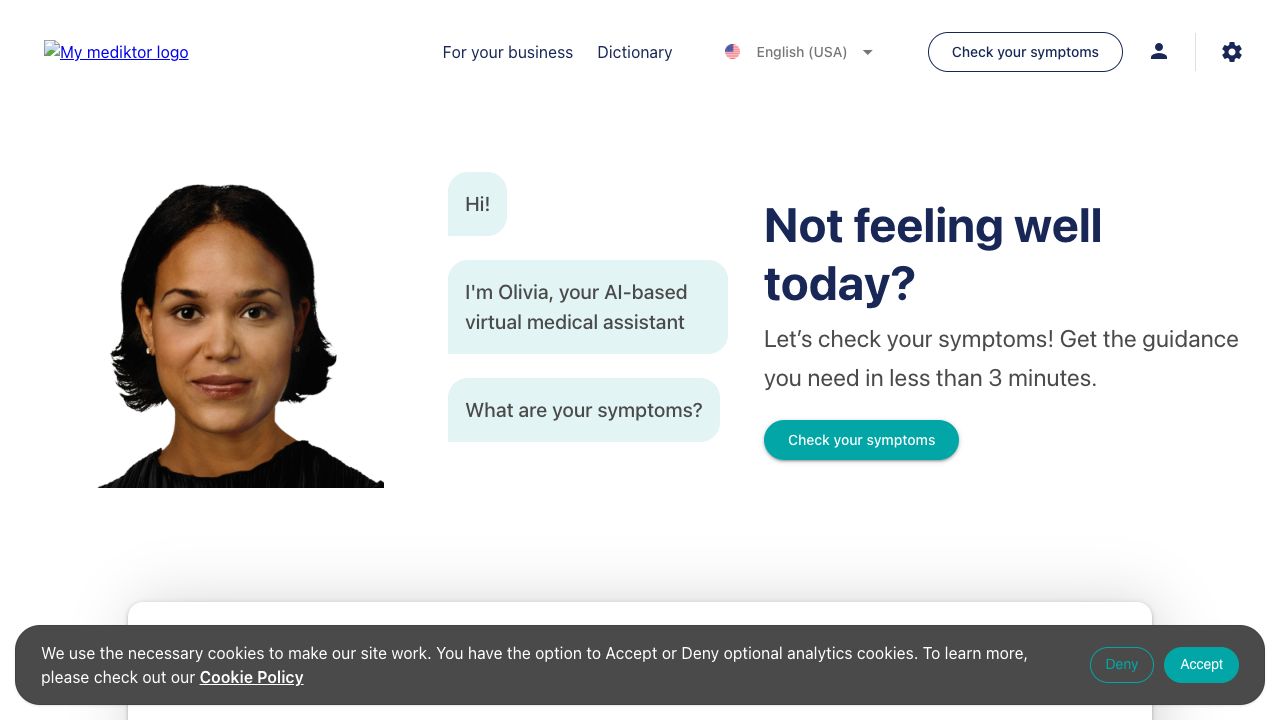 Mediktor is an AI-based medical assistant for triage and pre-diagnosis. It's an interactive tool that analyzes users' symptoms and evaluates their state of health. It also allows users to chat with a doctor in real time.