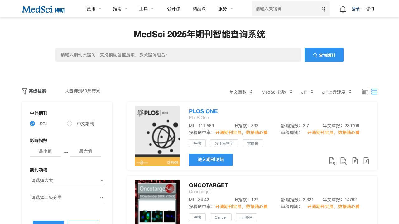 MedSci最新SCI期刊智能查询及投稿分析系统整理了最新被SCIE和SSCI收录的所有期刊杂志,包括SCI期刊ISSN号,期刊官方投稿网址,研究方向,SCI期刊分区,中国作者发表的文章,投稿经验等。