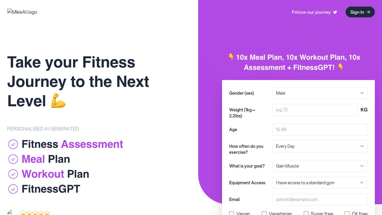Users fill out a form with their fitness information (gender, weight, age, exercise frequency, goals, equipment access, and dietary preferences). MikeAI then generates a personalized meal plan, workout plan, and fitness assessment. Users can also access FitnessGPT for fitness-related questions.