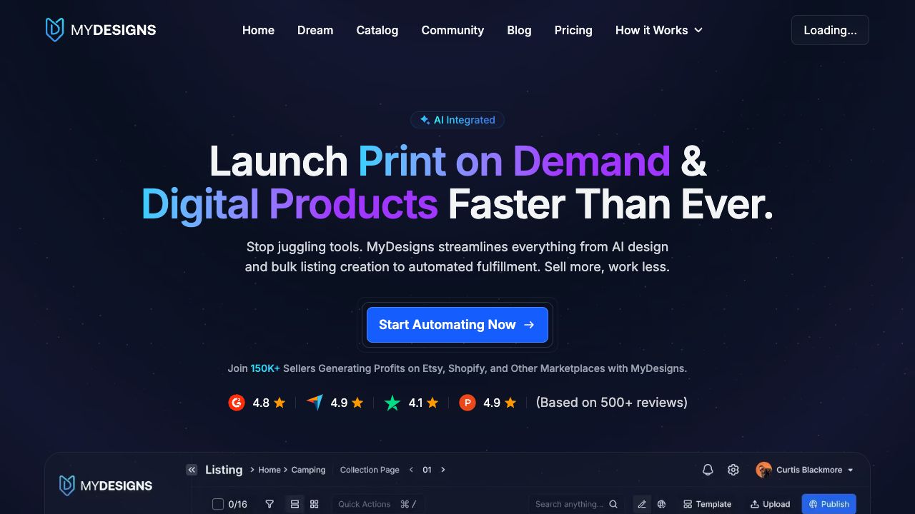 MyDesigns.io is an all-in-one platform designed to revolutionize print on demand (POD) and digital product businesses. It allows users to effortlessly design, manage, and sell custom merchandise on platforms like Etsy, Amazon, and Shopify. The platform offers bulk tools, premium mockups, seamless integrations, and AI-integrated features to streamline workflows and boost profitability. It caters to over 100,000 sellers worldwide, providing tools for product creation, optimization, publishing, and order fulfillment at scale.