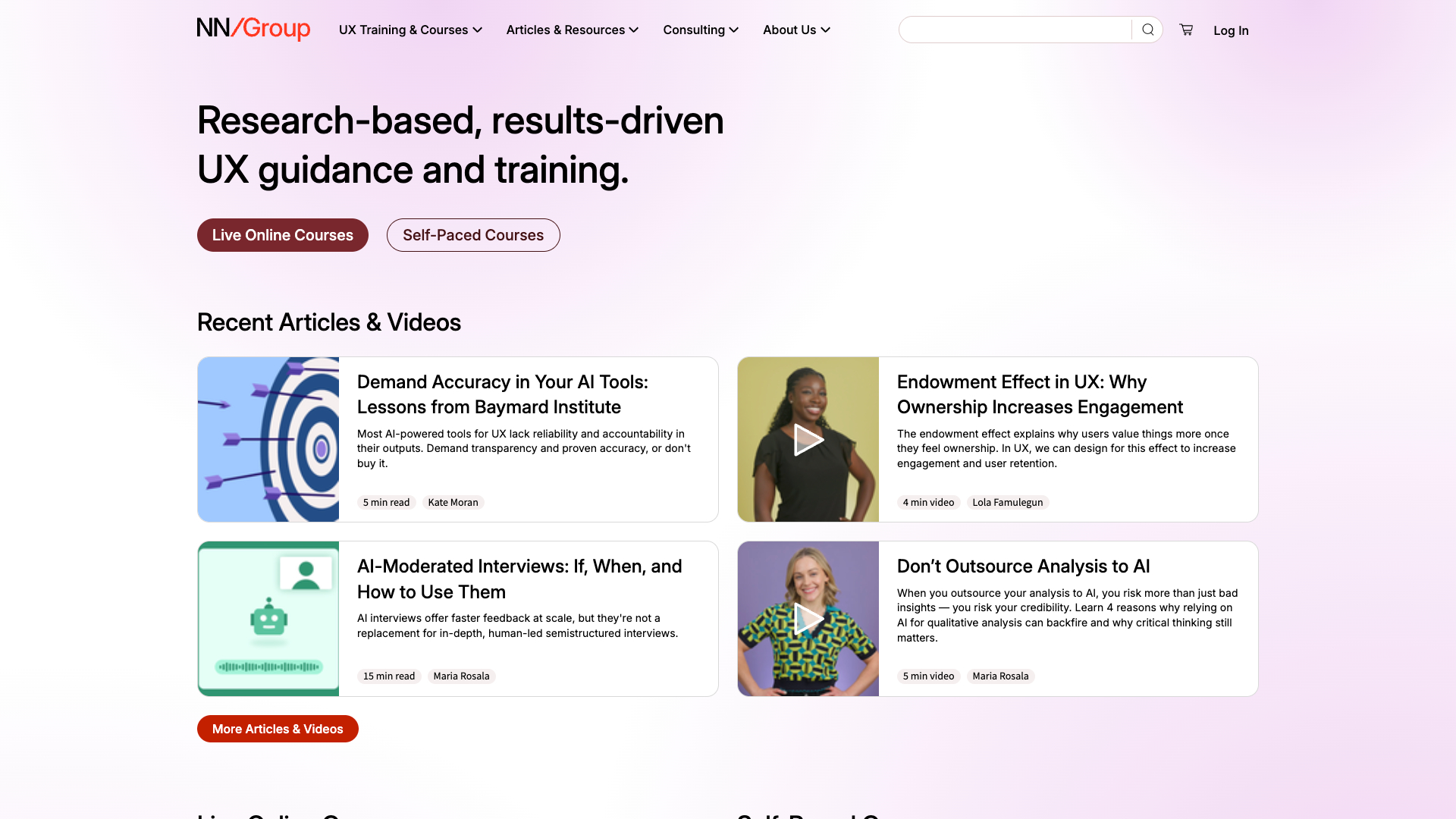A leader in the user experience field, NN/g conducts groundbreaking research, trains and certifies UX practitioners, and provides UX consulting to clients.