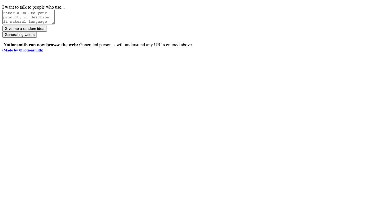 Notionsmith generates UX personas for any product, and lets you chat with them. You don't need to have built it, just describe what you have in mind. Notionsmith is a website that uses AI to generate UX personas for your product, then lets you chat with them.