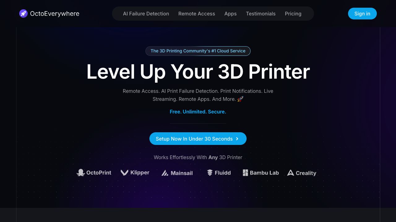 OctoEverywhere is a cloud service designed for the 3D printing community, offering free, private, and unlimited remote access to OctoPrint, Klipper, and Bambu Lab printers. It includes features like AI failure detection, notifications, live streaming, and remote apps, aiming to empower users with powerful and accessible tools.