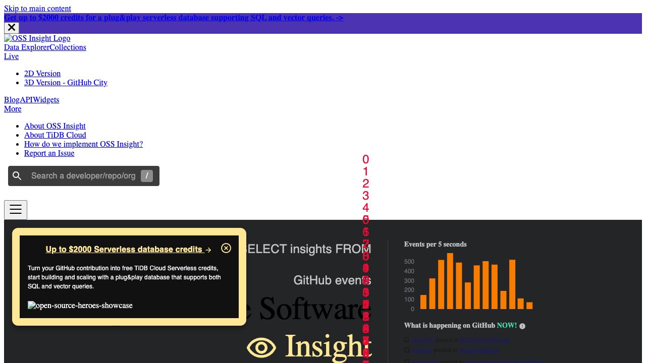 OSS Insight is a comprehensive Open Source Software insight tool that analyzes massive events from GitHub, powered by TiDB. It provides a GPT-powered querying tool called Data Explorer for GitHub live data exploration using natural language. It offers deep insights into developers and repositories on GitHub, covering stars, pull requests, issues, pushes, comments, and reviews. It also features trending repositories and hot collections.