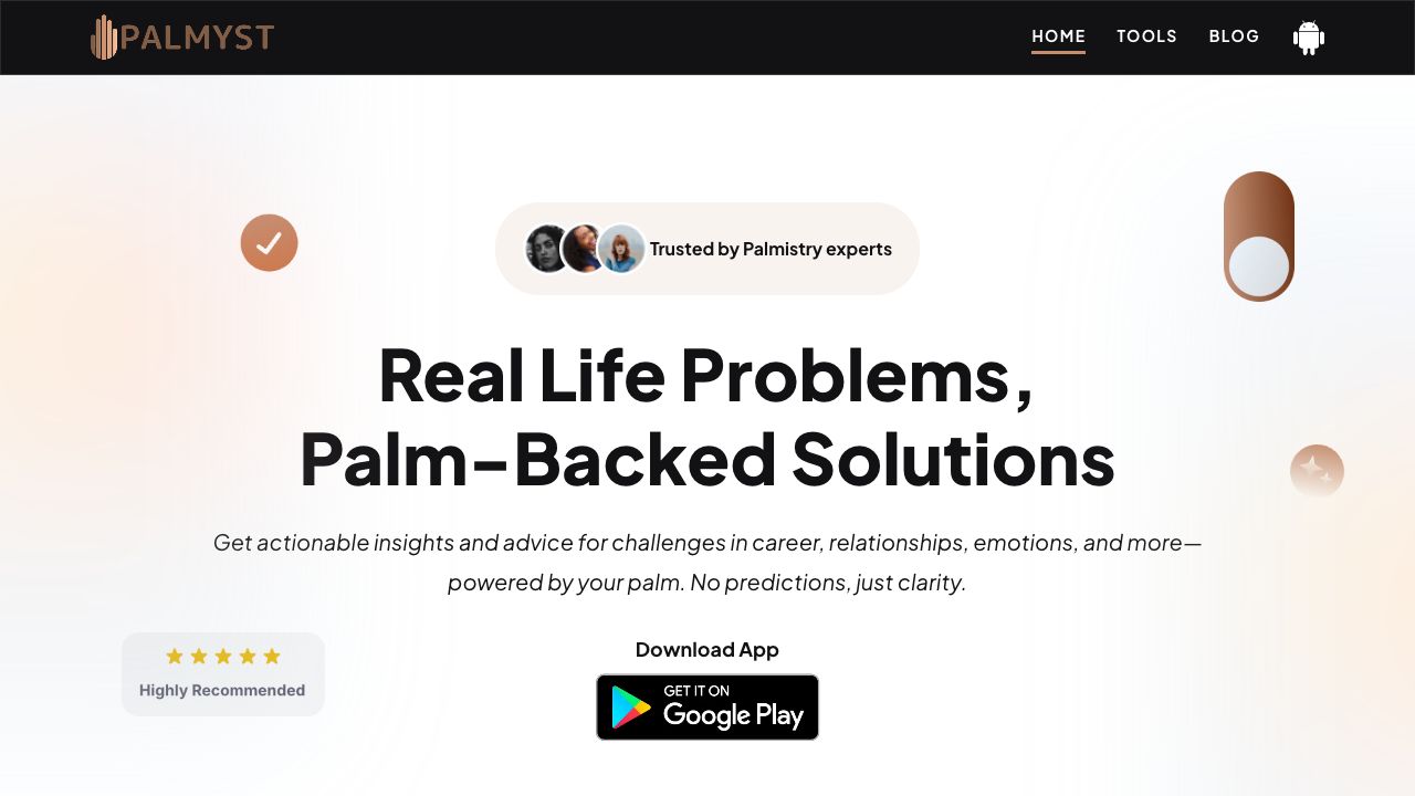 Palmyst is a platform that offers interactive palm reading tools to provide insights into various aspects of life, including relationships, career, health, and personal growth. By uploading an image of your palm, users can access personalized readings and actionable advice to navigate life's challenges and realize their potential. Palmyst aims to provide clarity and self-discovery through detailed analysis and personalized recommendations.