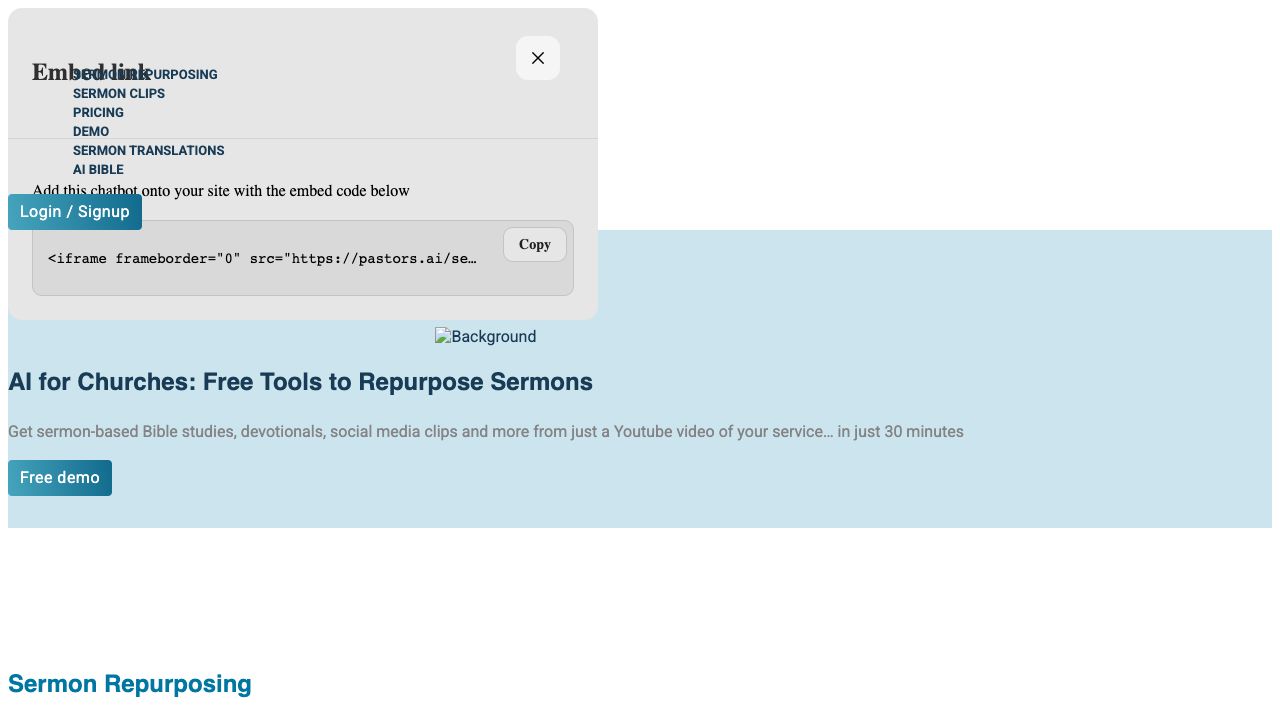 Pastors.ai provides AI tools for churches, allowing them to repurpose sermons into Bible studies, devotionals, social media clips, and more. Users can input a YouTube video link of a church service or upload a manuscript to generate various AI resources.