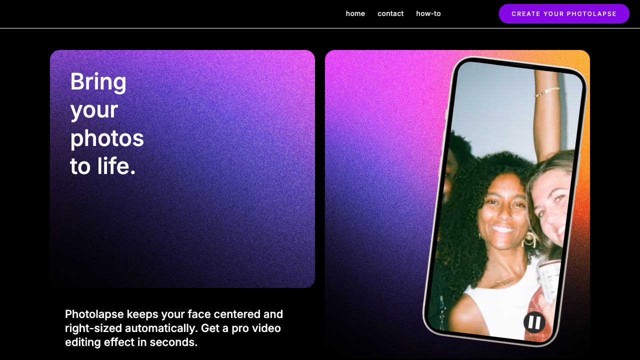 Photolapse is a video editing tool that uses face-detection AI to create face aging timelapse videos. Users upload photos, choose video settings, and download a video to share. It automatically centers the subject's face in the video.