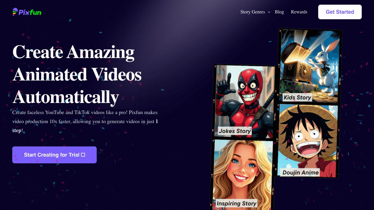 Pixfun is an AI-powered tool designed to automatically create animated videos for platforms like TikTok and YouTube. It streamlines video production by allowing users to generate videos in just one step. Users input their story, choose a style and voiceover, and the system automatically creates visuals and compiles the video. Pixfun offers reusable story templates, character consistency, and a curated story script library.