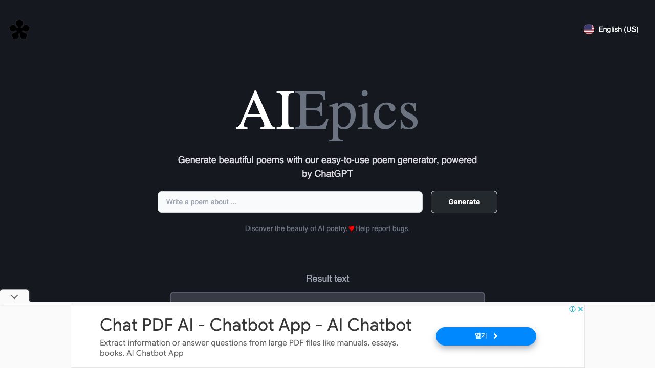 AIEpics is an easy-to-use online AI poem generator that allows users to create unique poems in seconds. Built using OpenAI’s GPT model and trained on a custom dataset of poems, AIEpics can generate personalized poems on any theme, simply by entering a prompt. It is a free online AI poem generator that uses OpenAI’s ChatGPT model which has been trained on a custom dataset of poems.