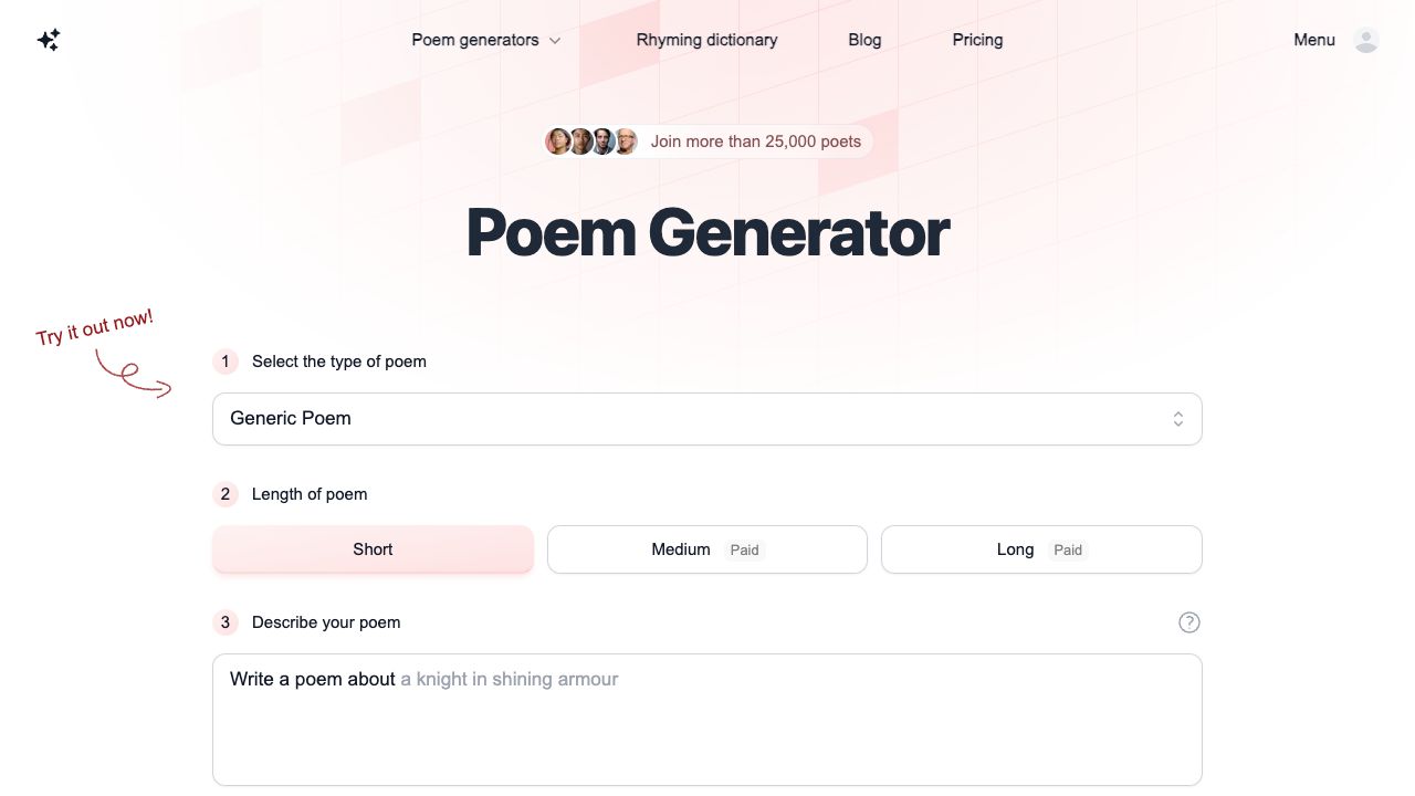 PoemGenerator.com is a collection of 22 poem generators and a rhyming dictionary to help you create the perfect poem for any occasion. It uses state-of-the-art artificial intelligence to generate poems in less than 10 seconds. Users can select the type and length of poem, enter a brief description, and click the generate button.