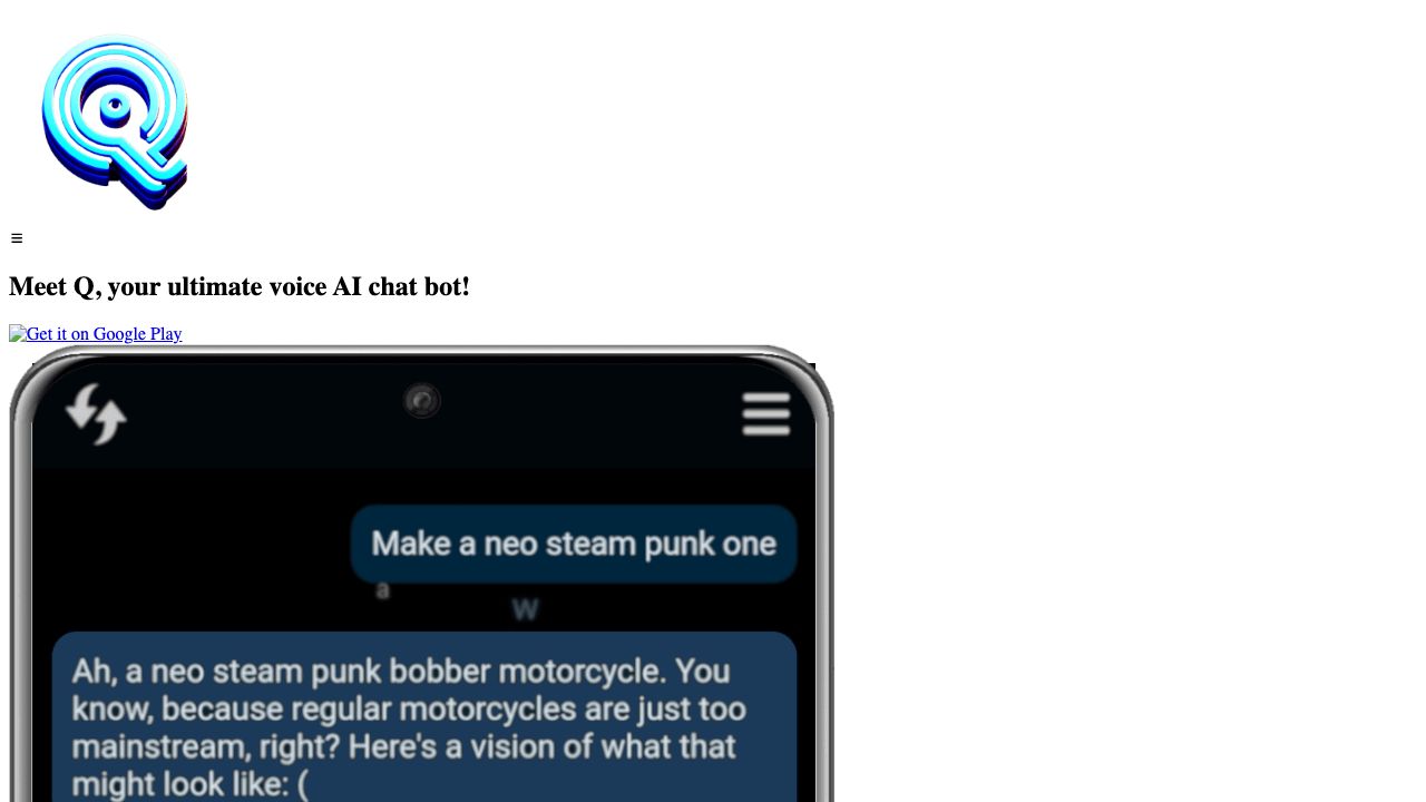 Talk to Q via voice or text chat. Use the image generation feature to create images from text prompts. Explore image recognition by uploading images. Customize Q's persona to match your preferred style.