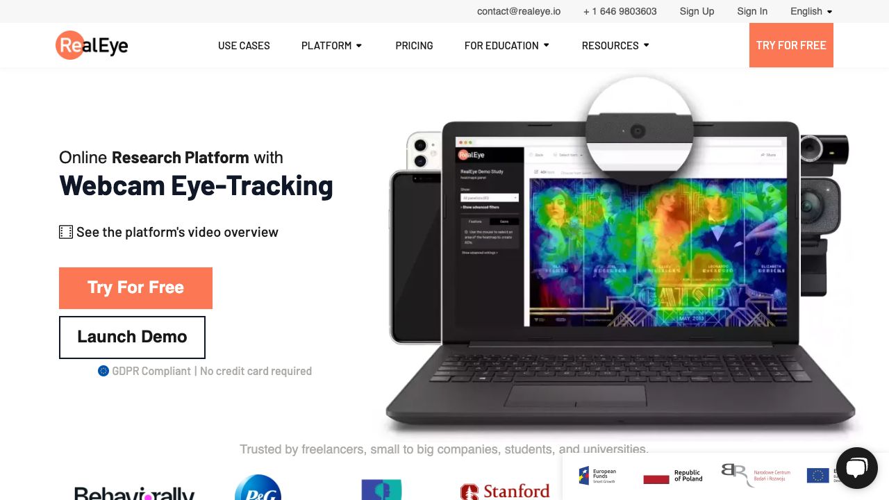 RealEye.io is an online research platform that uses webcam eye-tracking to help users create studies, track participants remotely, and analyze data instantly in a web browser. It offers features like online eye-tracking, attention and emotion analysis, study dashboards, mouse/key tracking, online surveys, and data export.
