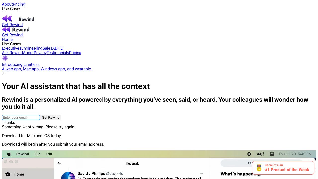 Rewind is a macOS app that acts as a search engine for your life, privately designed to help you find anything you've seen, said, or heard. It's a personalized AI powered by everything you’ve experienced, allowing you to overcome memory limitations by recording your screen and audio, transcribing and encrypting the data locally for your access only. Rewind can summarize meetings, draft emails, and much more, acting as a personal AI assistant.