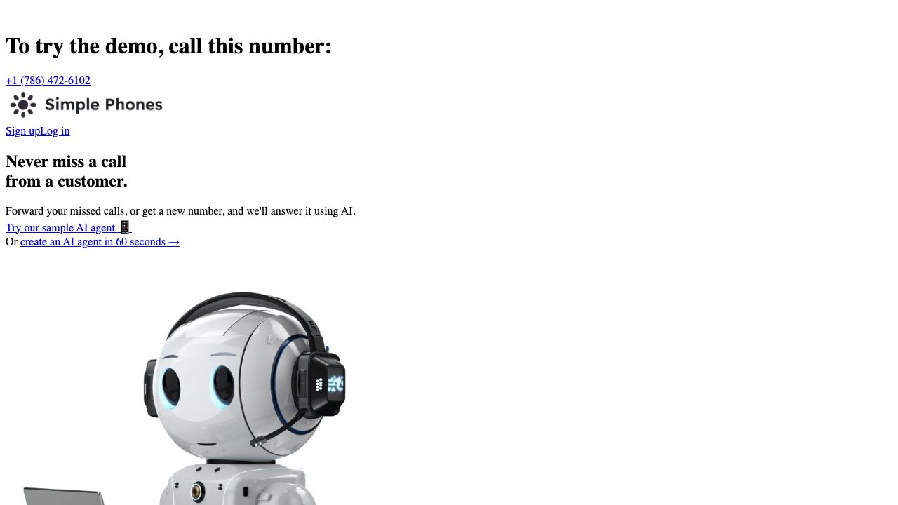 Simple Phones provides AI phone agents for businesses. It allows users to forward missed calls or get a new number, and the AI agent answers calls, improving over time with ongoing customization. Users pay 19¢/min for incoming calls and pre-load their account. The service offers features like inbound and outbound calls, logging, customization, routing, voice selection, crawling, and integrations with other systems.