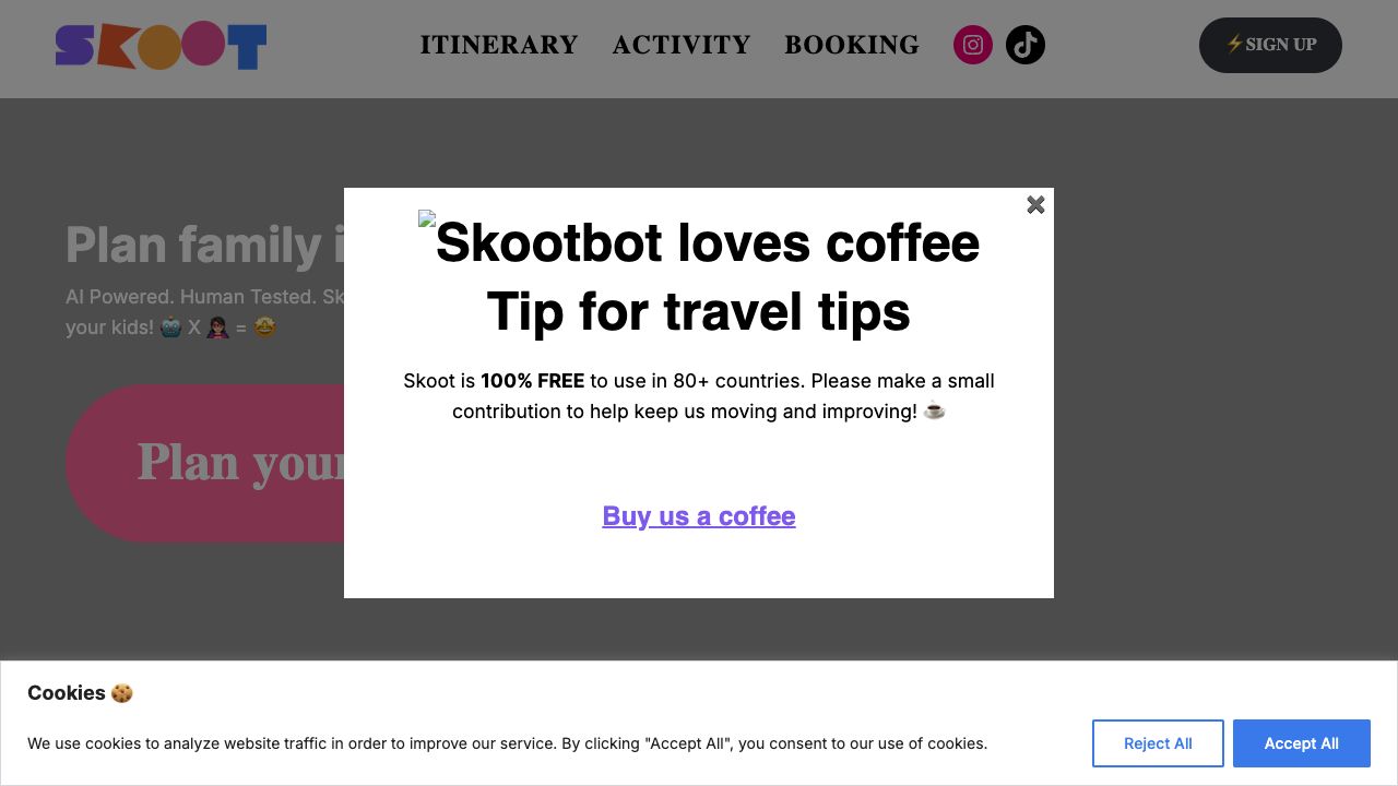 Skoot is a family-friendly AI travel and activity planning assistant. It helps parents plan adventures with their kids by providing itineraries, activity suggestions, and booking deals. Skoot uses AI to compare destinations, find activities, and suggest restaurants, taking into account budget, location, and special considerations. It also offers travel booking services through partnerships with Trip.com, SuperTravel, Holiday Taxis, Discover Cars, and Airalo.