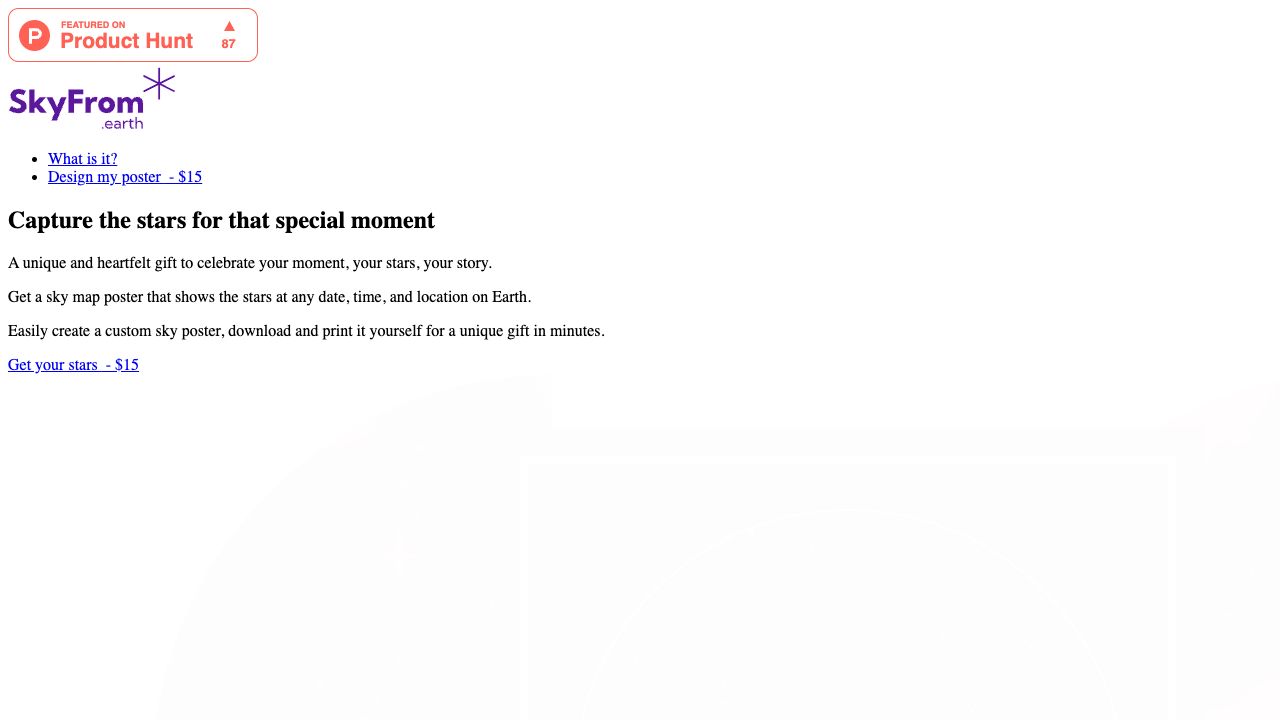 SkyFrom captures the alignment of the stars above you at the time and place of your special memory and creates a sky map poster. It is a perfect gift for weddings, anniversaries, birthdays, or any moment worth remembering. In minutes, you receive a high-resolution digital file that you can print at home or at a local print shop.
