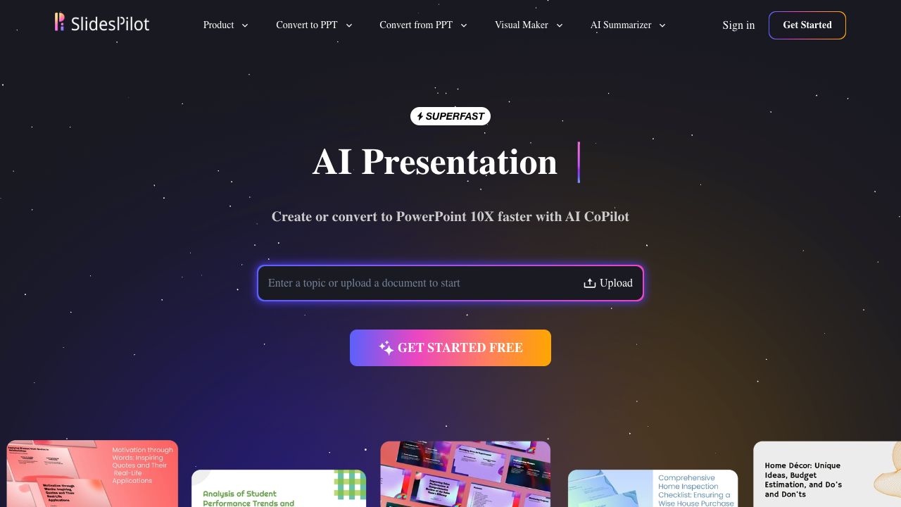 SlidesPilot is a comprehensive AI Presentation Suite designed for both business and education. It offers an AI Presentation Maker, AI Image Generator, and tools for converting various document types (like PDF, Word, Reports, Outlines, Research Papers, and YouTube videos) into editable PowerPoint presentations. It also supports conversions from PPT to other formats such as PDF, Word, JPG, PNG, and Text. The platform includes a Visual Maker for creating diagrams and infographics, and an AI Summarizer for different file types. SlidesPilot aims to simplify slide creation, enhance presentations with smart, AI-driven tools, and provides a vast collection of free PowerPoint templates and Google Slides themes to elevate presentations effortlessly.