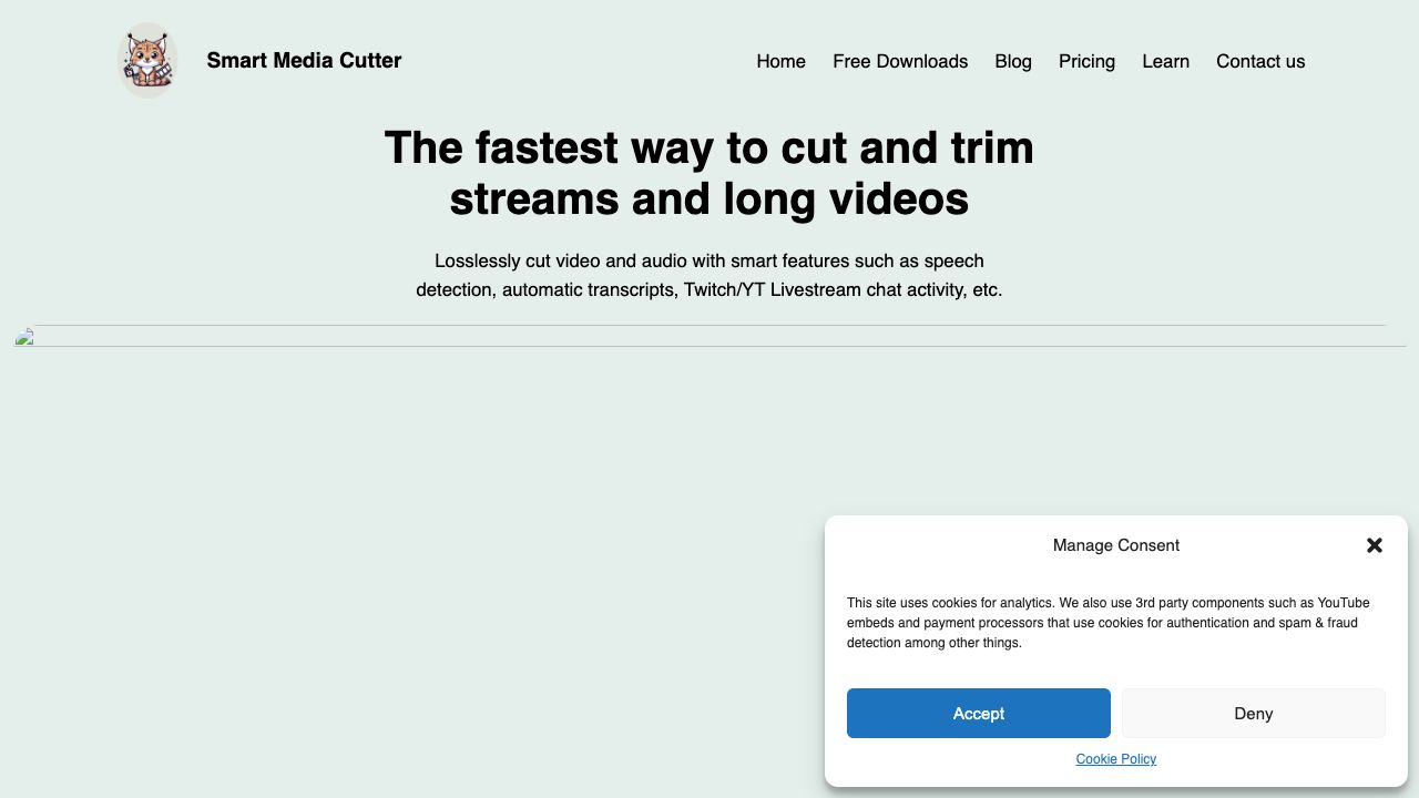 Smart Media Cutter is a software designed for video and podcast creators to losslessly cut video and audio smarter and faster. It utilizes AI transcriptions and an advanced audio denoiser to speed up the editing process. The software's video cutting technology saves rendering time and keeps videos at the original quality. It supports features like speech detection, automatic transcripts, and Twitch/YT Livestream chat activity analysis.