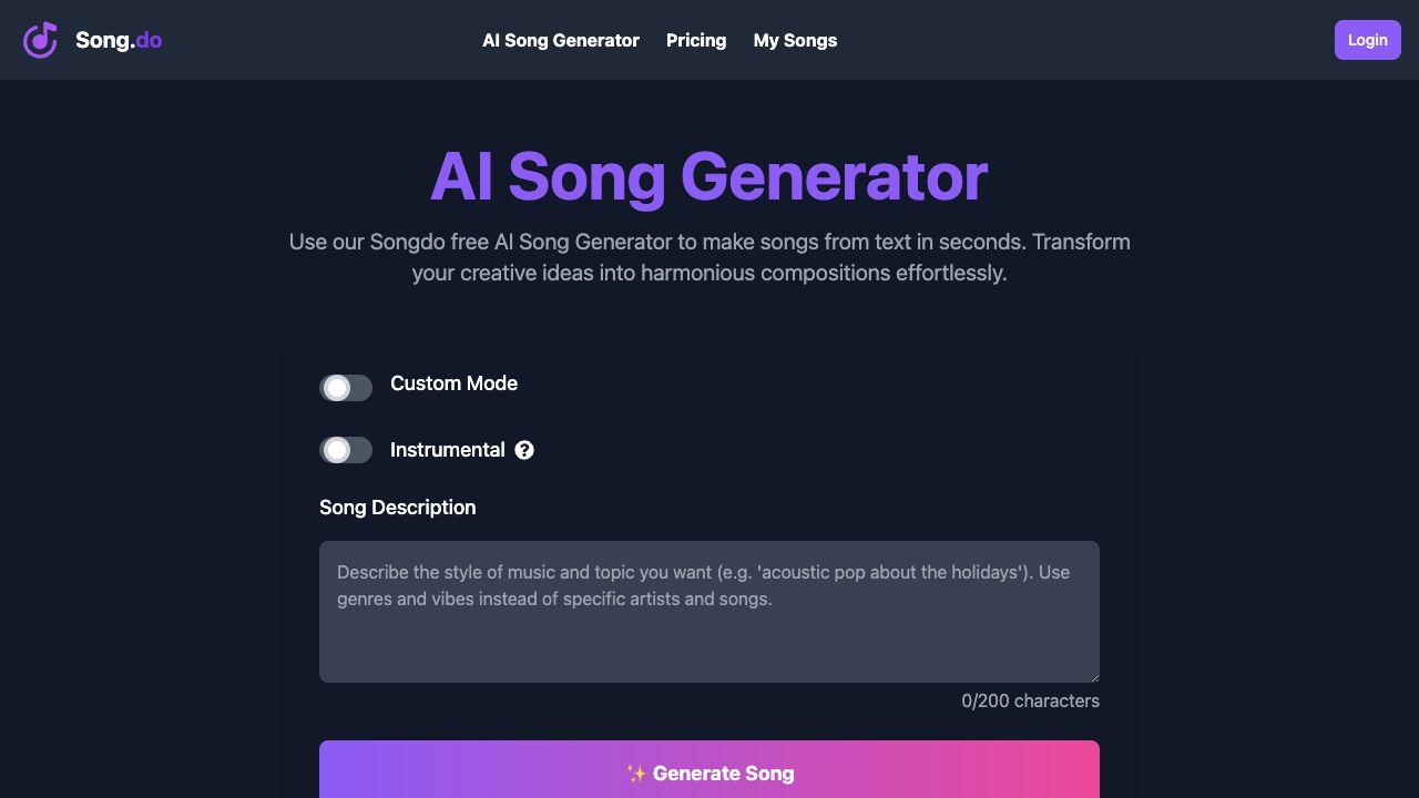 To use Song.do, input your idea by entering keywords, phrases, or sentences describing the song you want. Click the “Generate” button to transform your text into a unique song. Then, listen to your song online or download the MP3 to any of your devices.