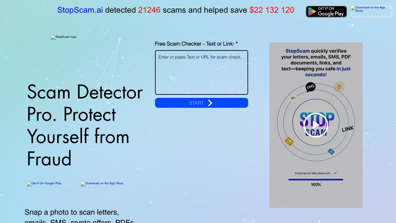 StopScam is an AI-powered scam detection app that scans physical documents, PDFs, text, and images in real time. It detects scams, phishing, and fake investments in seconds by scanning suspicious letters, emails, or links. It offers actionable insights, scam probability scores, and color-coded results. With unlimited scans via subscription, StopScam estimates potential financial losses and keeps you safe worldwide. It includes Spanish localization for a broader reach and features like FREE Security Check, live e-mail breach counter, and an AI cyber-security chatbot.