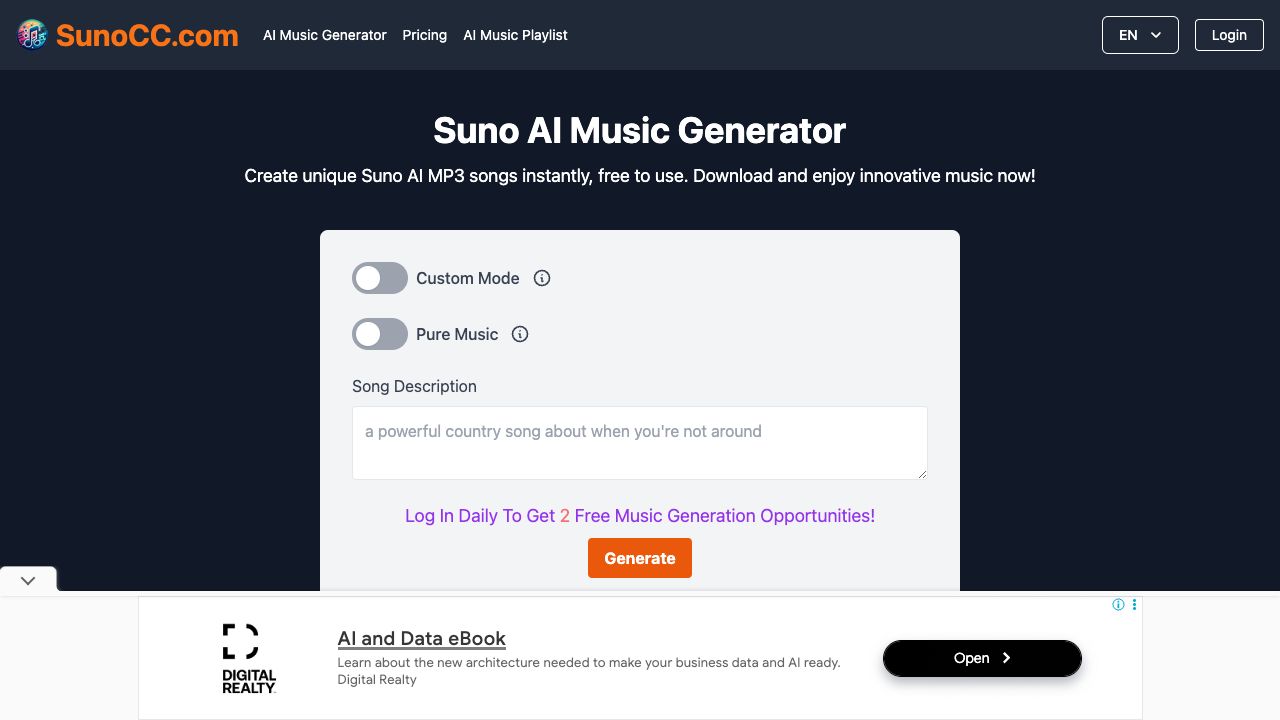 SunoCC.com offers a free Suno AI Music Generator, allowing users to create unique AI MP3 songs instantly. It provides a platform to download and enjoy innovative music, with options for custom music creation using text descriptions. The site also features AI music playlists and information on pricing plans for enhanced features.
