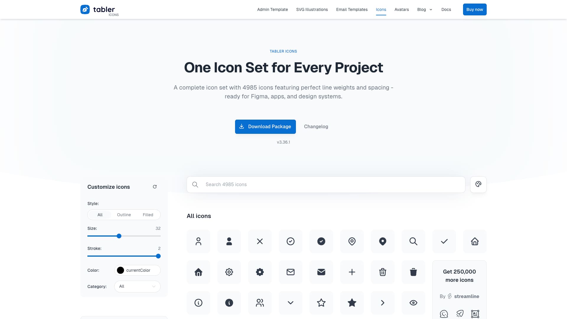 Tabler Icons provides 4962 free and open source SVG icons. You can easily customize size, color and stroke width. Packages are available for React, SolidJS, Vue, Figma, Svelte and Preact. Icons can be downloaded as PNG, Webfont, PDF or EPS files. All for free!