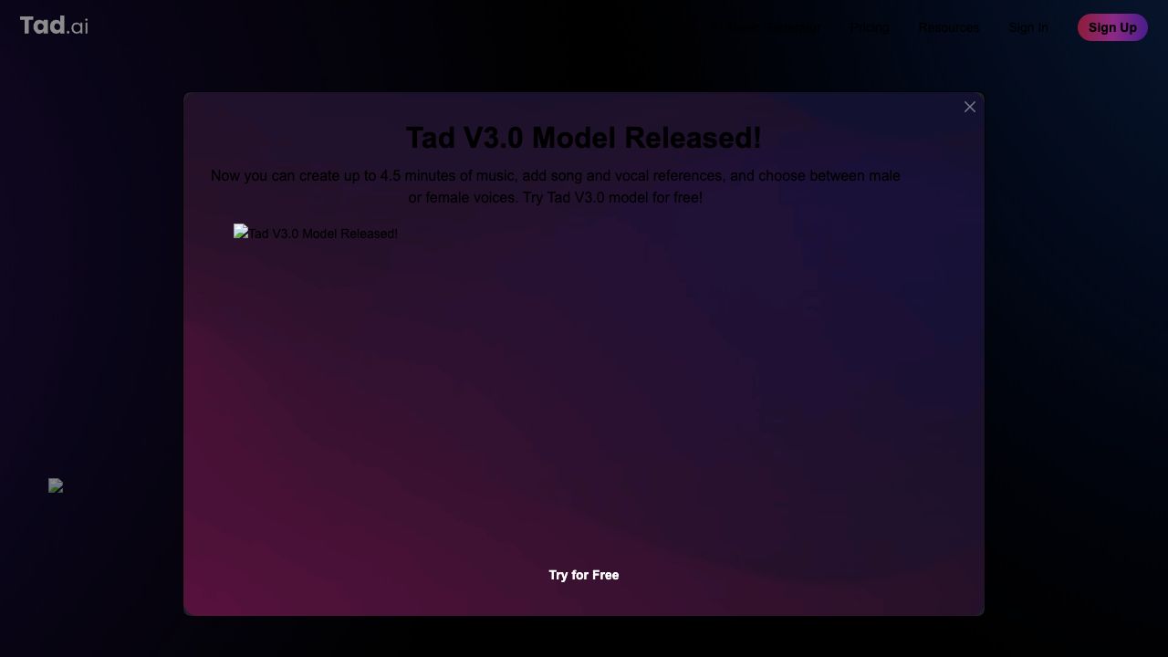 Tad.ai is an AI music generator designed to produce royalty-free, professional-sounding songs from simple text prompts. It leverages artificial intelligence and machine learning algorithms, trained on vast datasets of existing music, to craft unique, customized music compositions based on user preferences and input. Tad.ai collaborates with Kunlun Tech and utilizes the powerful Skymusic 2.0 model, which enhances its capabilities in generating high-quality music, including songs, instrumental music, and pure vocal tracks, and allows for audio file references.