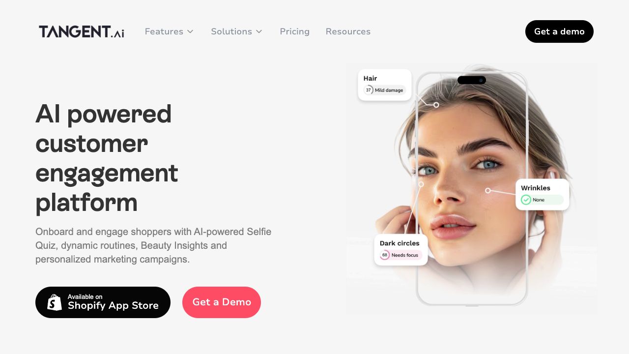 Tangent AI is an AI-powered customer engagement platform that helps beauty brands personalize, engage, and transform customer experiences. It offers features like Selfie Quiz, dynamic routines, Beauty Insights, and personalized marketing campaigns. It provides skin and hair analysis with quiz and CRM integrations, personalization, bundle routine dashboards, and segment users with precision. Tangent AI aims to improve customer engagement, drive new visitors, increase revenue, and provide data-driven growth for beauty brands.