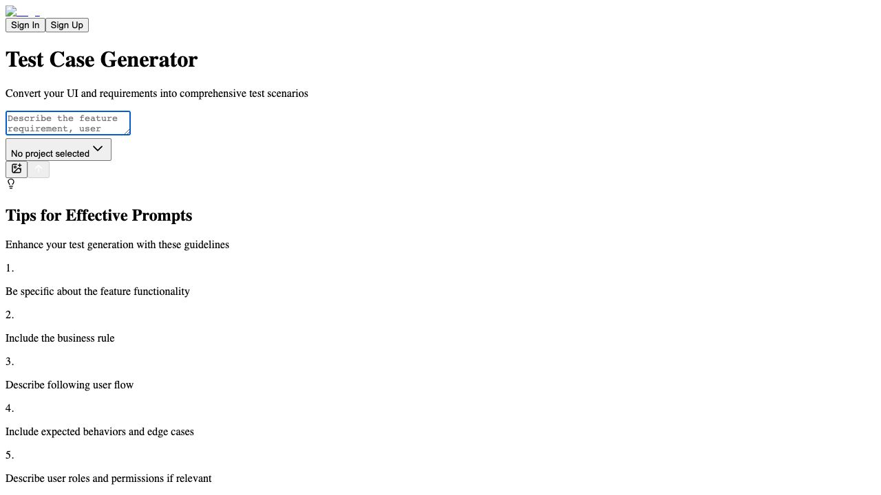 Sign up or sign in to TestGenAI, then use the Test Case Generator to convert UI and requirements into test scenarios. Provide specific prompts including feature functionality, business rules, user flow, expected behaviors, edge cases, user roles, permissions, and mockups.