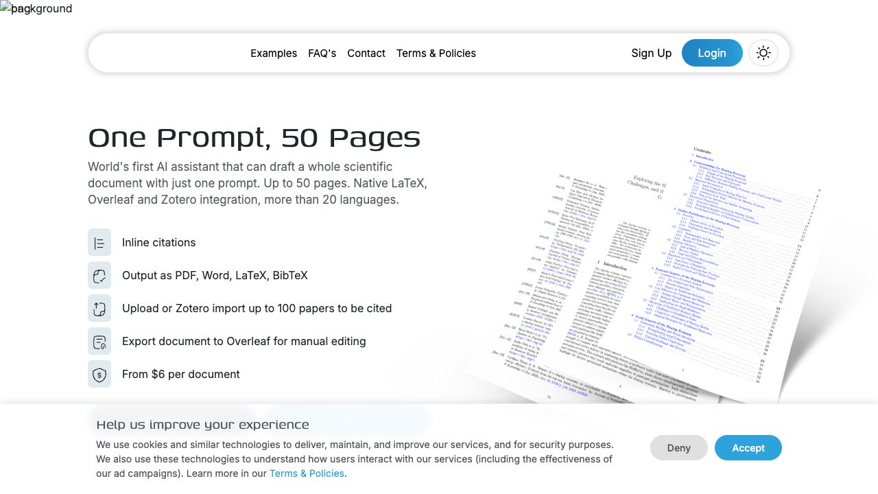 ThesisAI is an AI assistant designed to draft scientific documents, up to 50 pages, from a single prompt. It offers native LaTeX integration, supports over 20 languages, and provides inline citations. Users can upload or import up to 100 papers for citation and export documents to Overleaf for manual editing.