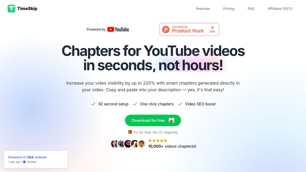TimeSkip is a Chrome extension that generates timestamps/chapters for YouTube videos directly in the player in one click. It is designed as a time saver for podcasts and educational videos, and optimizes chapters for SEO. It instantly creates SEO-optimized chapters and timestamps for YouTube videos, boosting searchability and engagement, making it perfect for podcasts, webinars, and tutorials.
