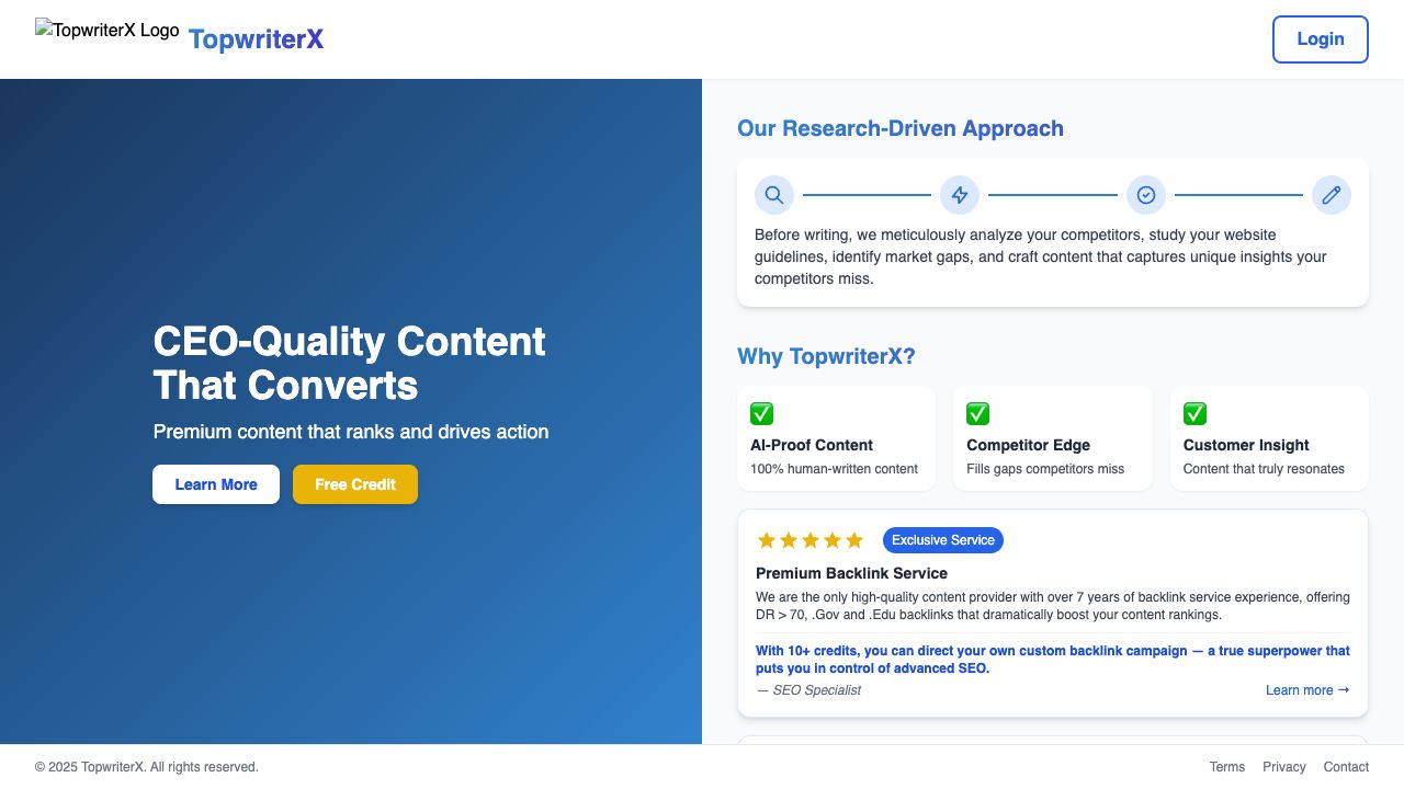 Use TopwriterX to automate writing for various business needs, from emails to landing pages. Leverage their research-driven approach for content creation and utilize their premium backlink service to improve SEO rankings.
