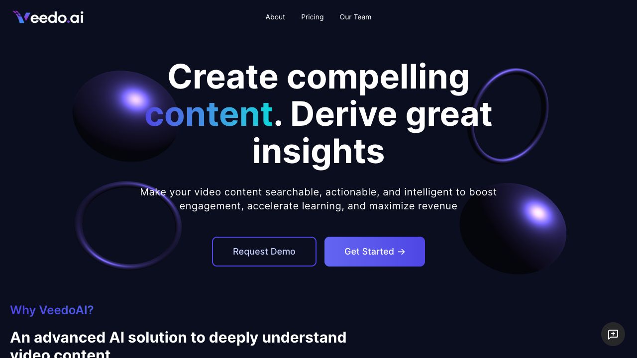 VeedoAI uses deep learning to extract actionable insights from video content to help you better understand the video, identify patterns, and delight your audience. It offers features like contextual search, AI chat, short video creation, video to blog conversion, frame explanation, transcription, smart scene detection, and transcript summarization.