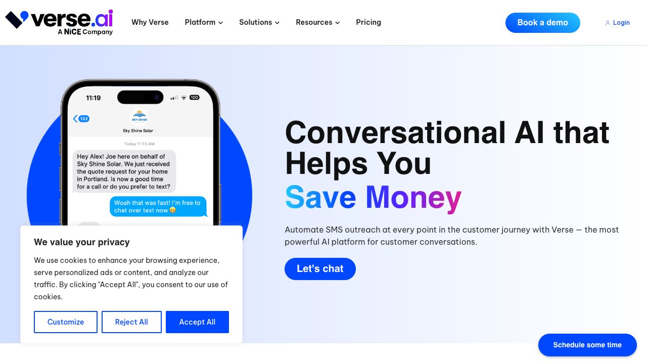 Verse.ai converts leads with AI-powered SMS conversations. Automated SMS messages keep prospects engaged and increase conversion rates. Verse offers 24/7 AI-powered conversation management in three pricing plans for any industry and company size.