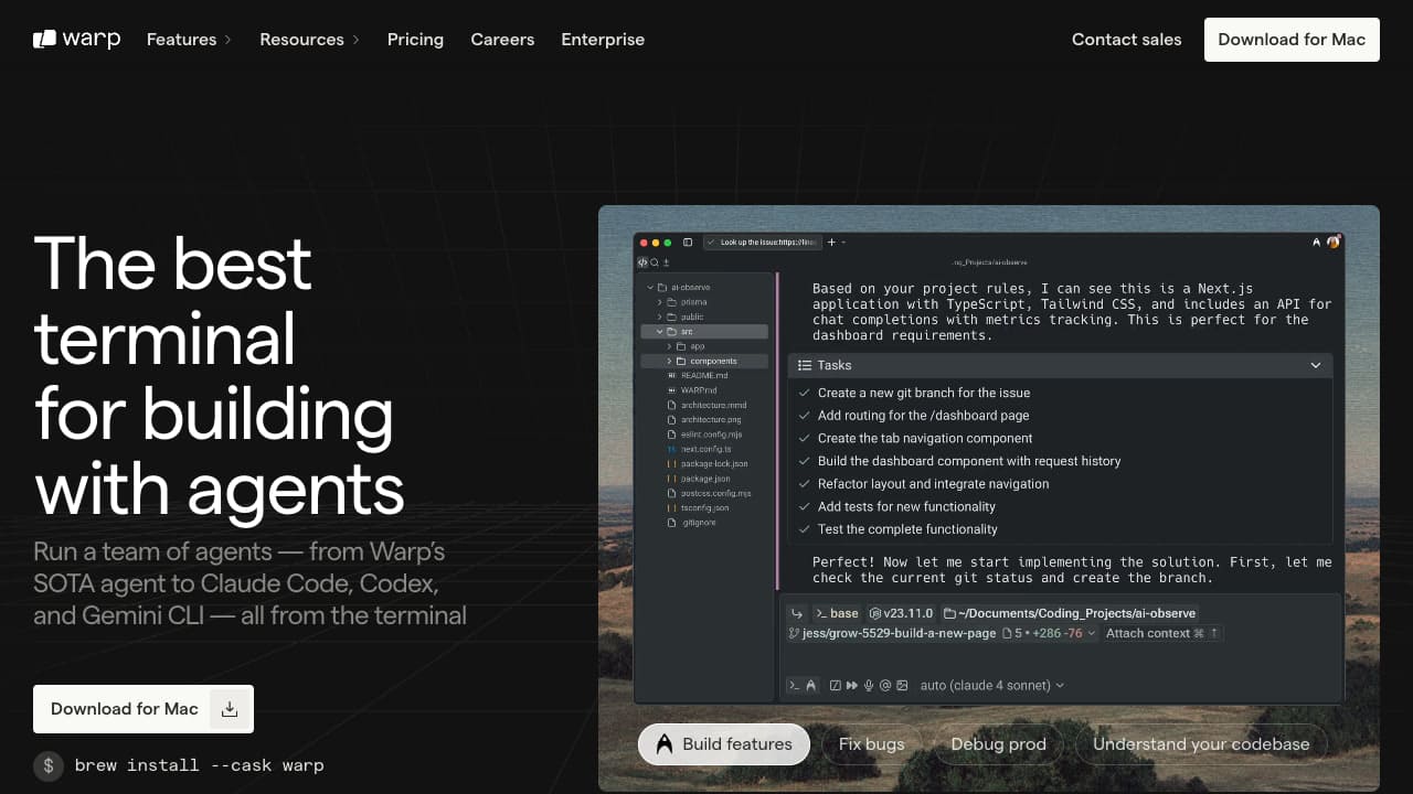 Download and install Warp for your operating system (MacOS, Windows, or Linux). Use natural language prompts for AI assistance, generate code, and delegate tasks to AI. Save and share resources with your team using Warp Drive.