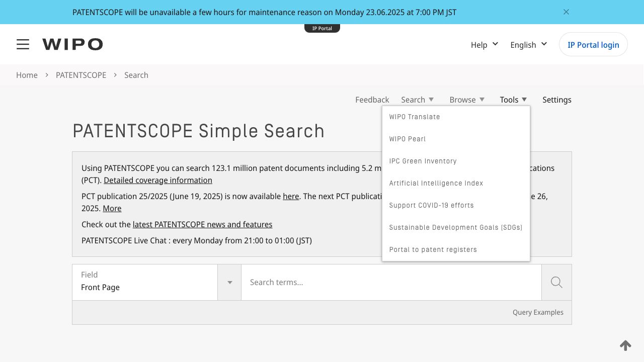This patent search tool allows you not only to search the PCT database of about 2 million International Applications but also the worldwide patent collections. This search facility features: flexible search syntax; automatic word stemming and relevance ranking; as well as graphical results.