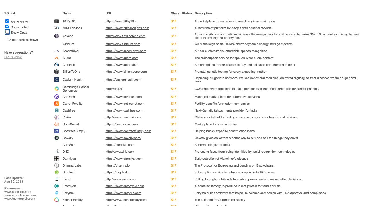 Names and descriptions of companies funded by Y Combinator, a seed accelerator.