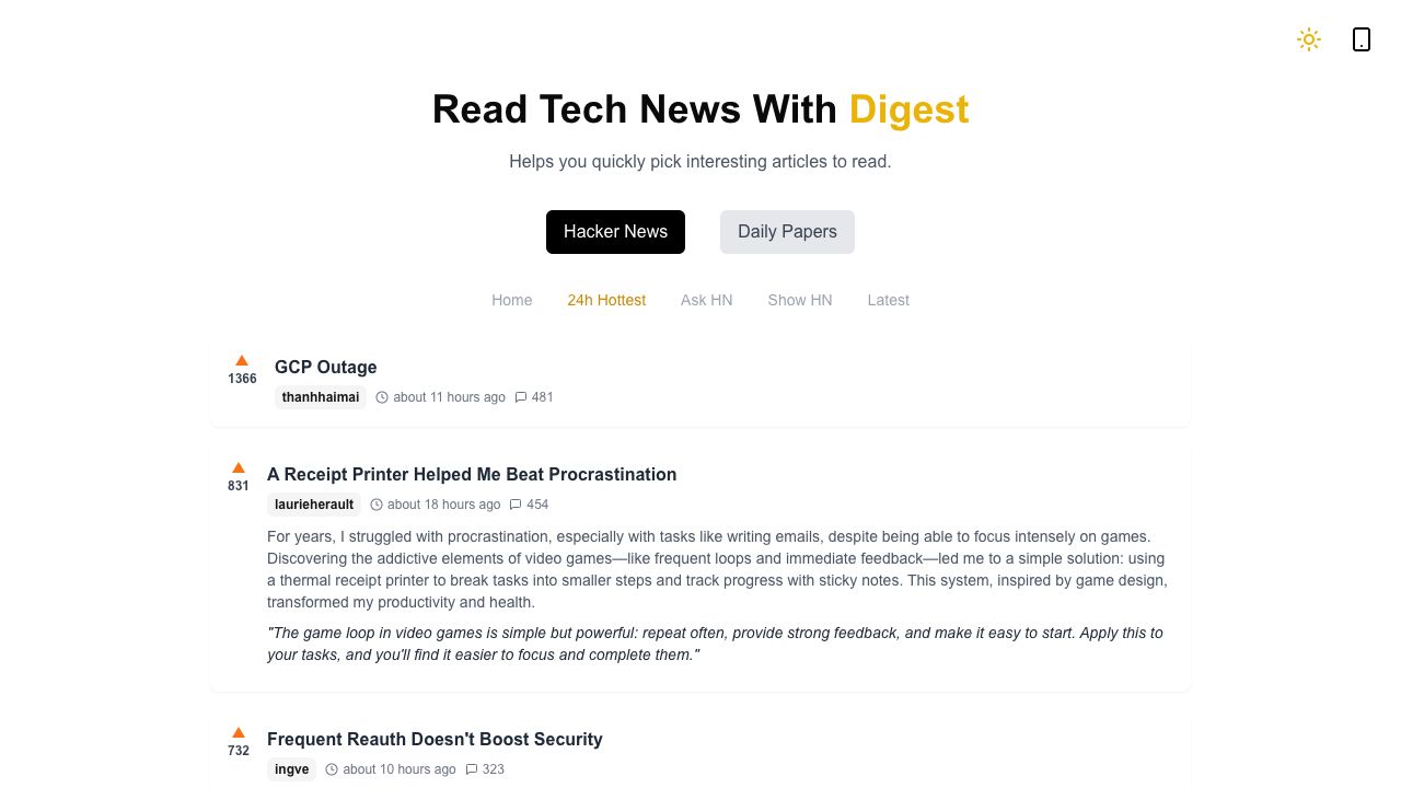 Zeli automatically compiles, summarizes, and extracts key points from Hacker News and HuggingFace papers. Users can browse the digests to quickly select interesting articles to read.
