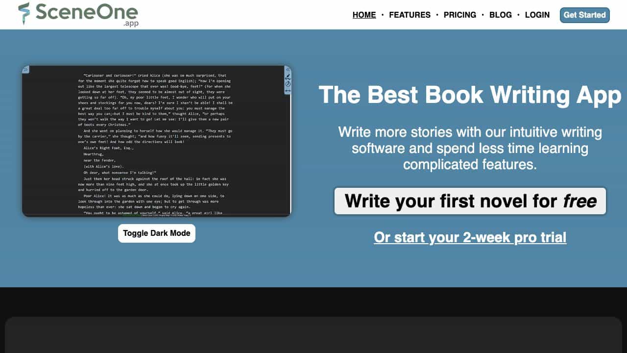 Scene One is an online book writing software designed to help writers create stories with an intuitive writing app, minimizing the time spent on complicated features. It offers a simple text editor and manages scenes and projects. The software securely stores words in the cloud, accessible from any device. It includes features like an AI Writing Assistant, word count tracking, a custom wiki for world-building, and manuscript compilation and export to PDF or DocX.