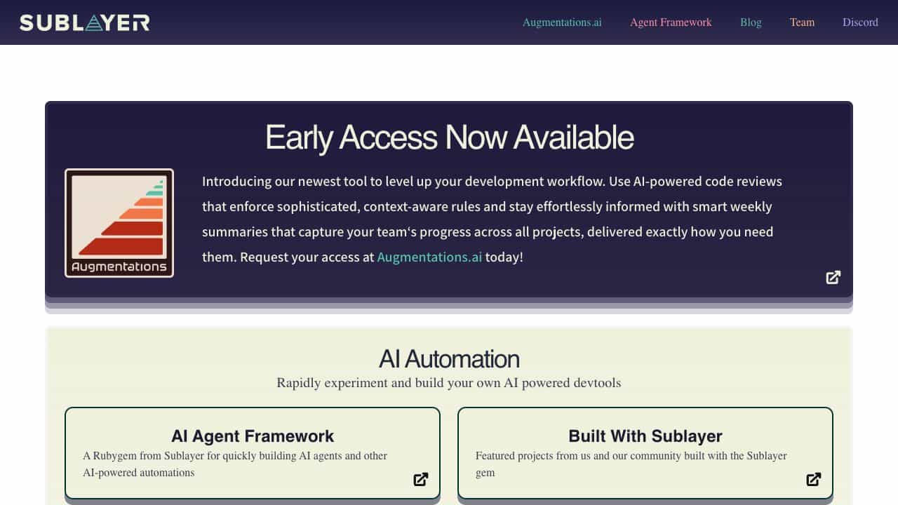 Use Sublayer's Rubygem to quickly build AI agents and AI-powered automations. Request early access at Augmentations.ai to use AI-powered code reviews and smart weekly summaries.