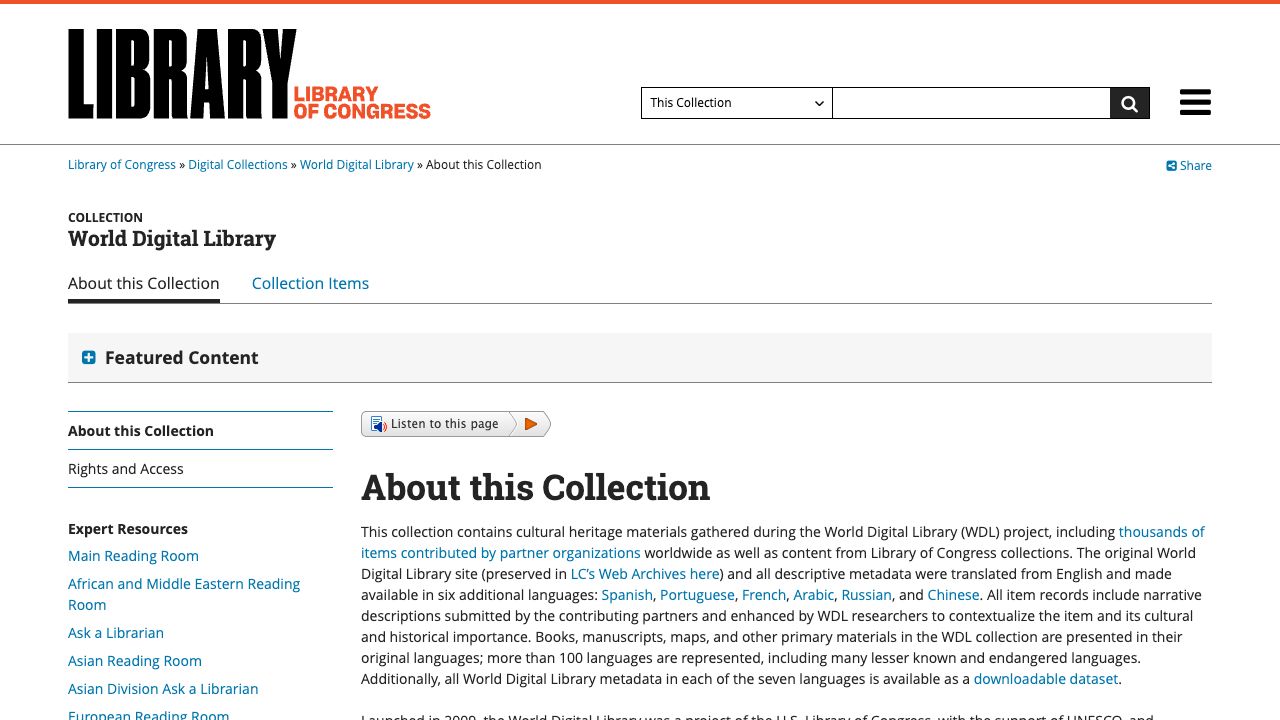 This collection contains cultural heritage materials gathered during the World Digital Library (WDL) project, including thousands of items contributed by partner organizations worldwide as well as content from Library of Congress collections. The original World Digital Library site (preserved in LC’s Web Archives here) and all descriptive metadata were translated from English and made available in six additional languages: Spanish, Portuguese, French, Arabic, Russian, and Chinese. All item records include narrative descriptions submitted by the contributing partners and enhanced by WDL researchers to contextualize the item and its cultural and historical importance. Books, manuscripts, maps, and other primary materials in the WDL collection are presented in their original languages; more than 100 languages are represented, including many lesser known and endangered languages. Additionally, all World Digital Library metadata in each of the seven languages is available as a downloadable dataset.