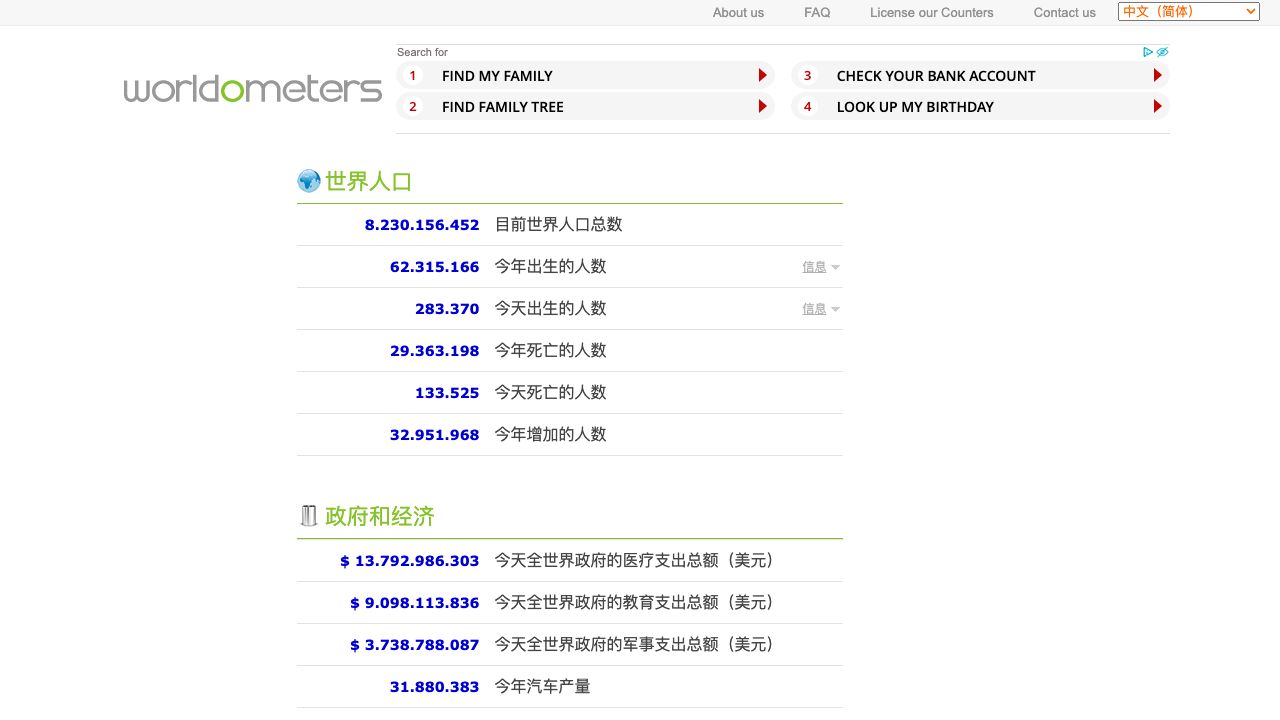 这里提供关于人口、政府、经济、社会、媒体、环境、食物、水、能源和健康的世界实时统计数据。更有有关世界人数钟、二氧化碳(CO2)排放量、全球饥荒、公共开支、生产和消费数据等众多有趣的统计情况。