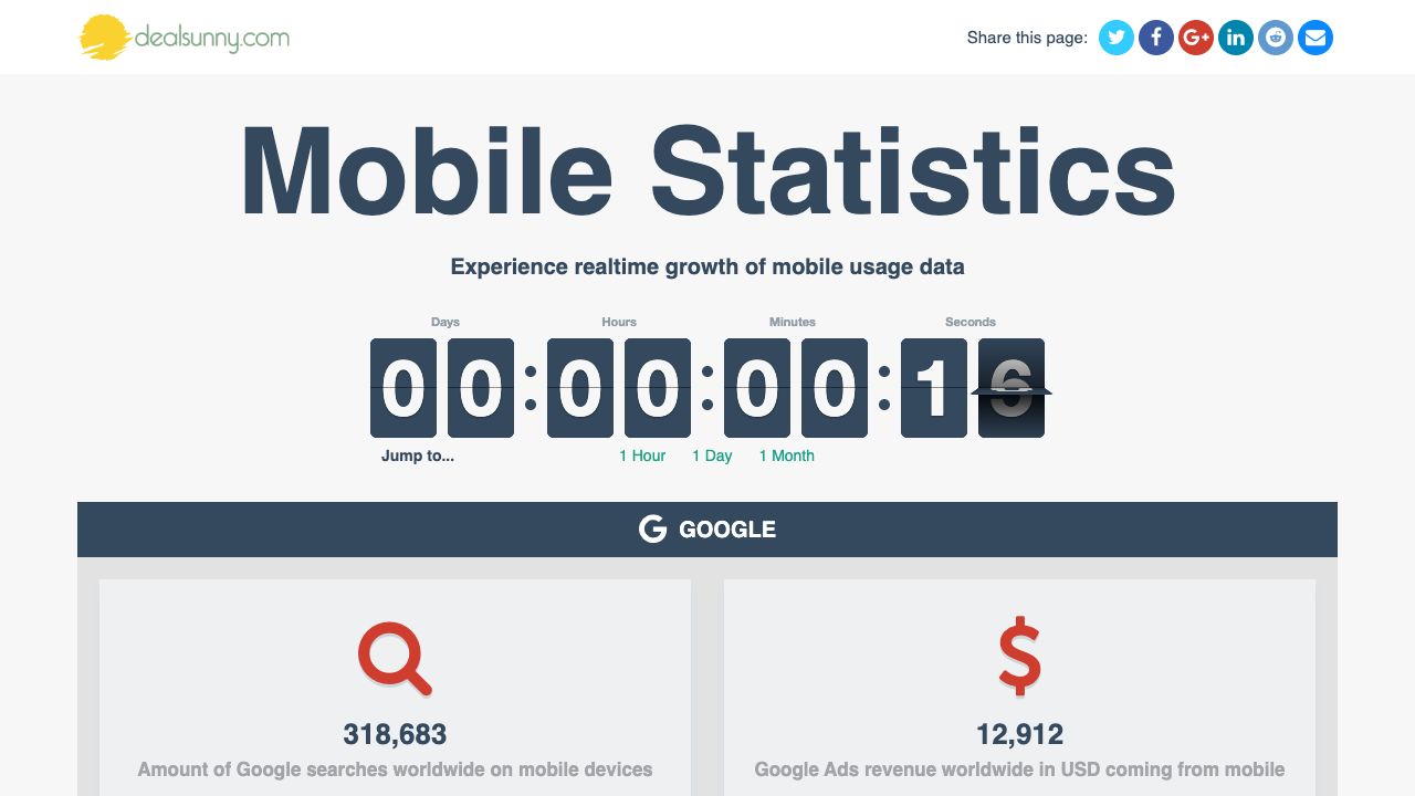 Experience mobile usage statistics per second in realtime. Statistics about Google, Facebook, Apple, WhatsApp, Instagram, Twitter, Uber, Amazon, PayPal, Tinder and more.