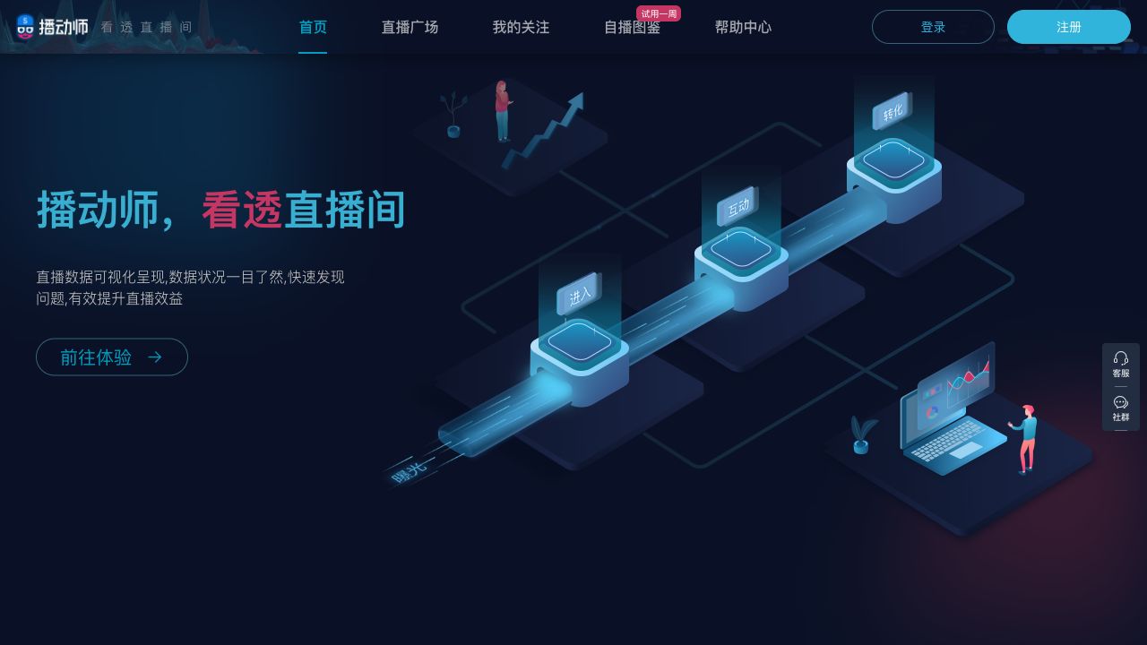 播动师官网,播动师是抖音直播数据专业分析平台,专注于直播过程的流量获取和流量转化的深度分析,基于直播行业的底层逻辑并结合播动师平台特有的数据分析图表工具为直播团队提供高效、有价值的决策支持。实时追踪直播数据,快速发现各账号直播过程中的优缺点,持续优化直播过程和策略,让团队避坑的同时快速成长,让直播持续获利。