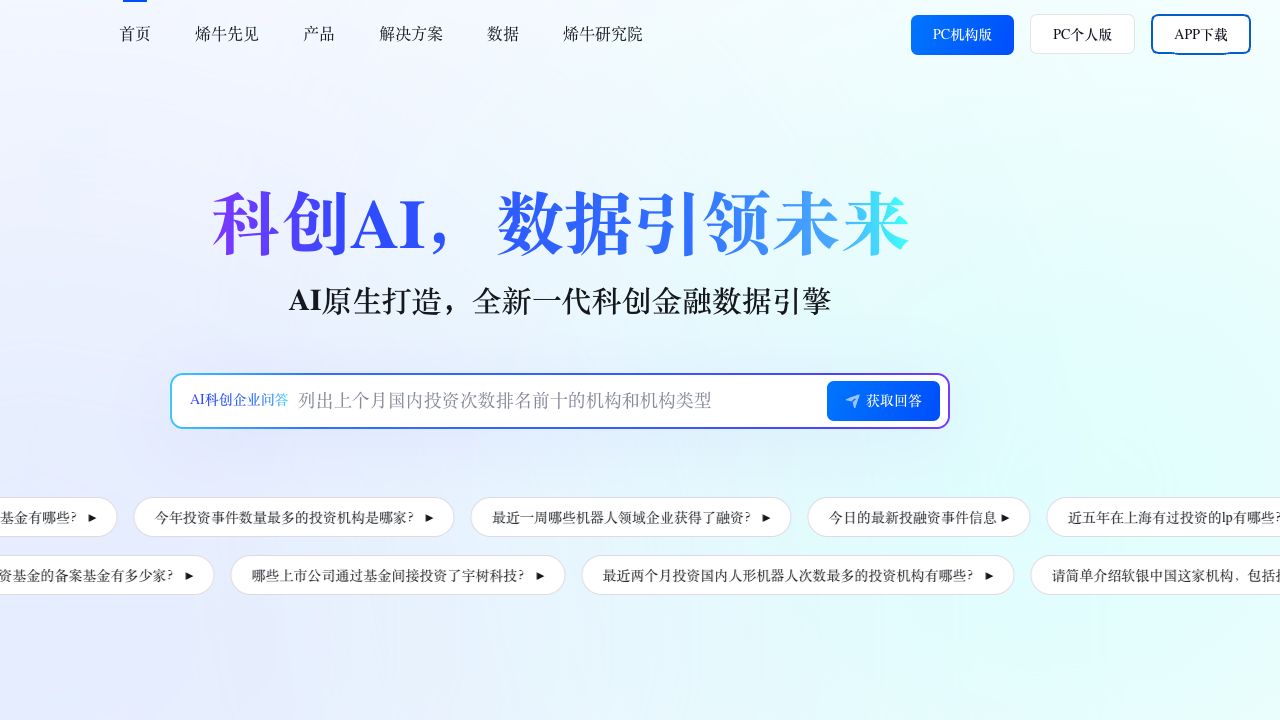 烯牛数据是一家科创金融数据服务商,涵盖了科创企业数据、创业人才数据、创投机构数据、政府引导基金数据等多种数据源,为全链条全周期科创金融提供数据分析及模型服务。