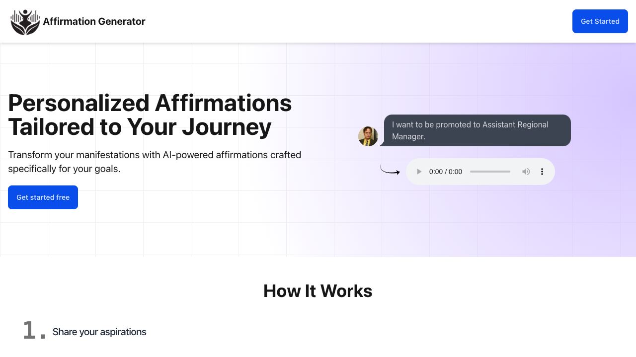 Users input their aspirations, the AI generates tailored affirmations, and then users listen to these affirmations, aligning themselves with their path to success. The listening experience can be customized with soothing sounds and adjustable intervals.