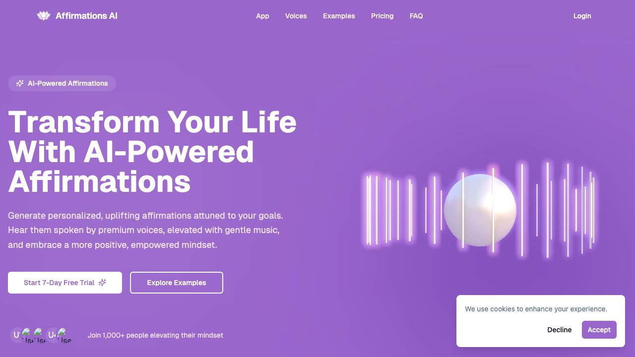Affirmations AI is a powerful tool that uses artificial intelligence to generate personalized affirmations in both text and audio formats. Our platform helps users create custom-tailored positive statements designed to transform their mindset. It offers features like AI-powered affirmation writing, premium voice generation, background music, advanced editing tools, and library organization.