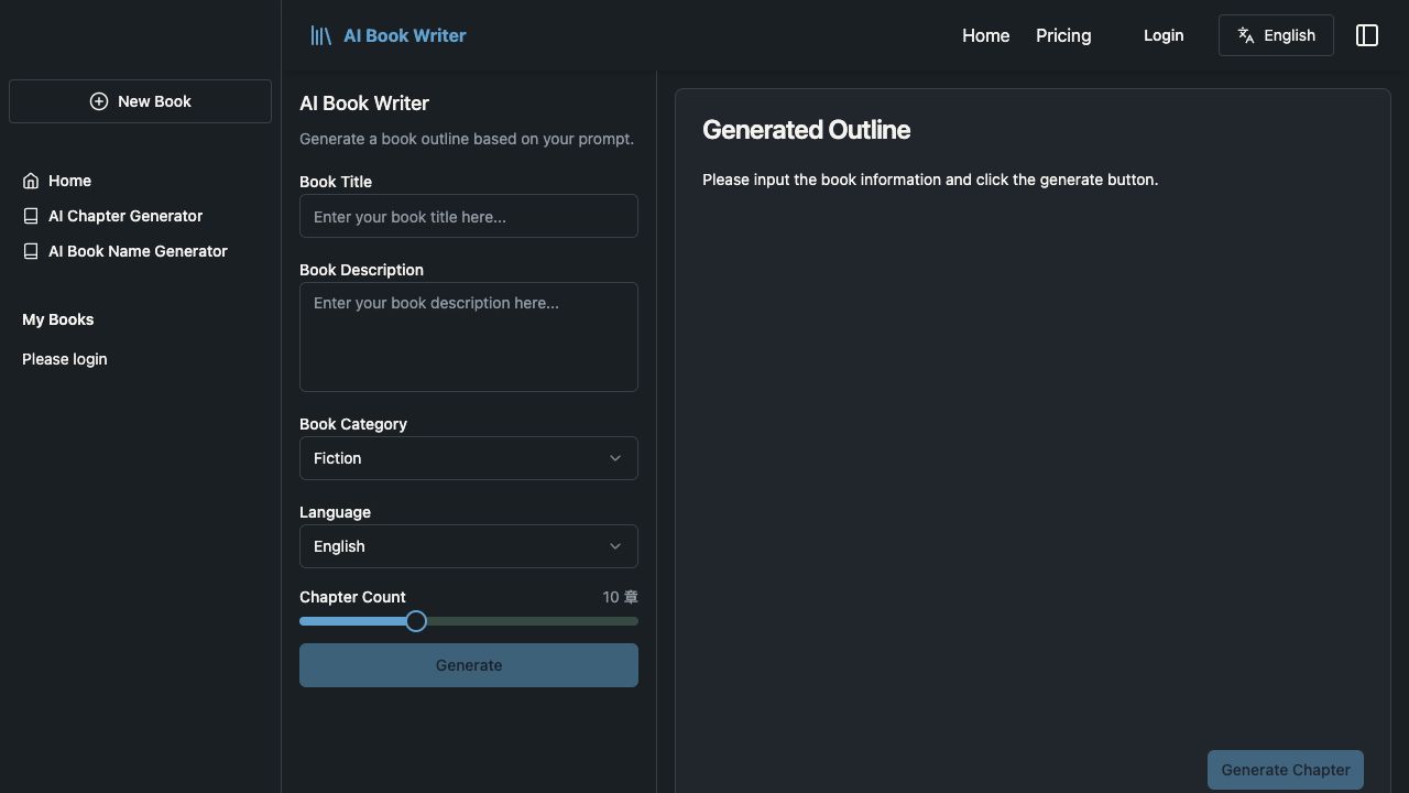 1. Enter book details like title, genre, and a brief description. 2. Generate a book outline using AI. 3. Generate chapters by providing a title and summary/outline. 4. Review, edit, and save your progress.