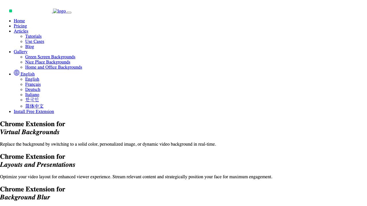 Install the Webcam Effects Chrome plugin from the Chrome Web Store. Once installed, the plugin integrates directly into your Chrome browser and can be configured in a few seconds. No additional tools are needed.